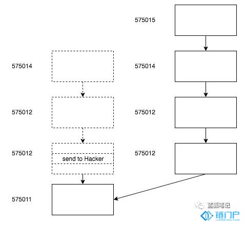 區塊575011包含了黑客的交易,隨后的區塊照常在它上面增加。如果礦工在包含黑客交易的區塊之前構建另一條替代的鏈,則有機會重新取回被黑客盜走的比特幣。這條替代延續鏈不會包含黑客的交易,并且必須比當前鏈增長更快,并在某個時間點它展示出更多的工作量,并且所有的比特幣客戶端都重組它。在重組后,該黑客交易將不會存在于網絡中。也就是說,區塊575012和其之后的區塊將不會在網絡中存在。