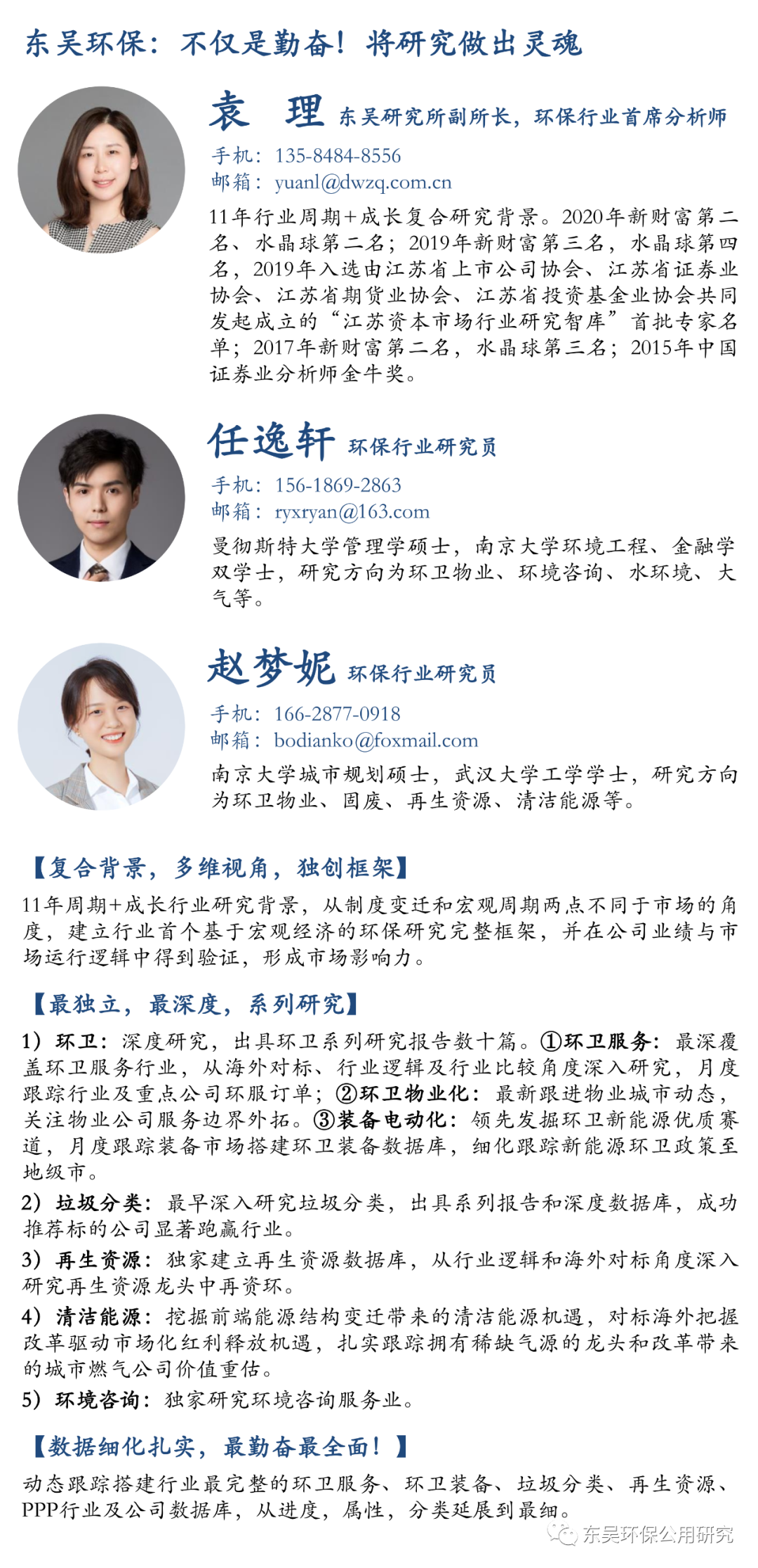免責申明:本公眾訂閱號(微信號:dongwuhb)由東吳證券研究所環保團隊設立,系本研究團隊研究成果發布的唯一訂閱號。本公眾號所載的信息僅面向專業投資機構,僅供在新媒體背景下研究觀點的及時交流。本訂閱號不是東吳證券研究所環保團隊研究報告的發布平臺,所載內容均來自于東吳證券研究所已正式發布的研究報告或對已發布報告進行的跟蹤與解讀,如需了解詳細的報告內容或研究信息,請具體參見東吳證券研究所已發布的完整報告。本訂閱號所載內容不構成對具體證券在具體價位、具體時點、具體市場表現的判斷或投資建議,不能夠等同于指導具體投資的操作性意見。本訂閱號所載內容僅供參考之用,接收人不應單純依靠本資料的信息而取代自身的獨立判斷,應自主做出投資決策并自行承擔風險。東吳證券研究所及本研究團隊不對任何因使用本訂閱號所載任何內容所引致或可能引致的損失承擔任何責任。本訂閱號對所載內容保留一切法律權利。訂閱人對本訂閱號發布的所有內容(包括文字、圖片、影像等)未經書面許可,禁止復制、轉載;經授權進行復制、轉載的,需注明出處為“東吳證券研究所”,且不得對本訂閱號所載內容進行任何有悖原意的引用、刪節或修改。
