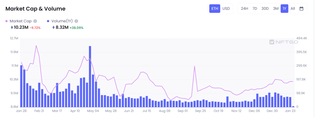 根據相關數據,NFT 總市值在 2022 年年初第一季度達到峰值。峰值時間點后隨市場發展,整體市值呈現下降趨勢。