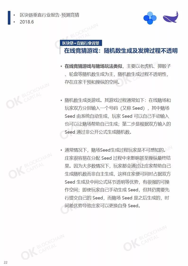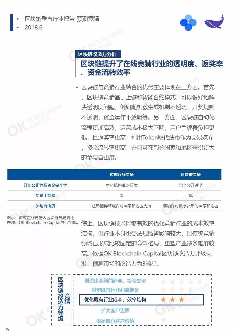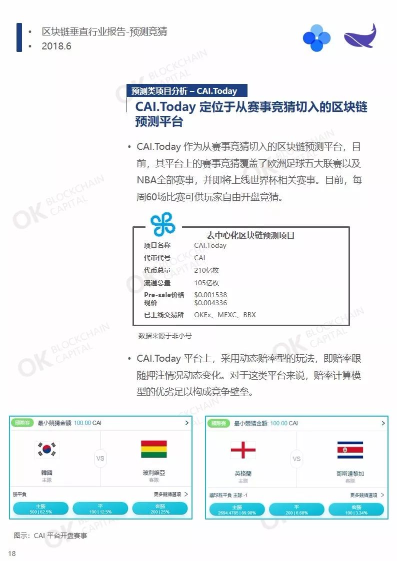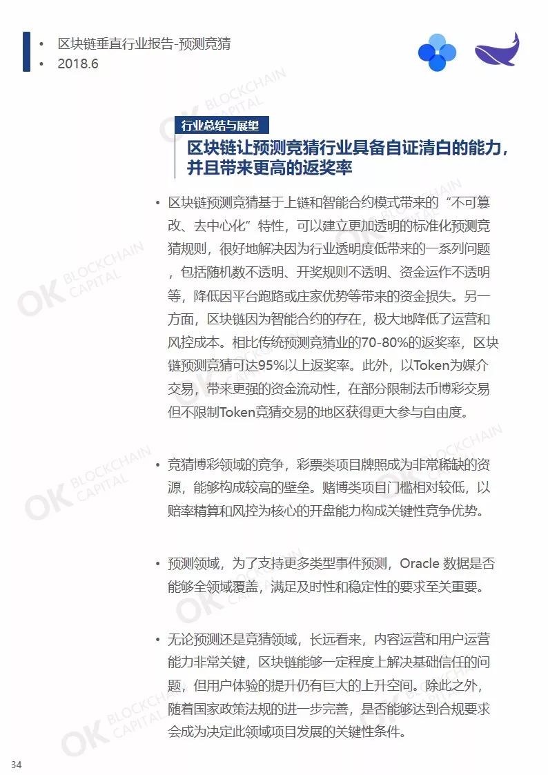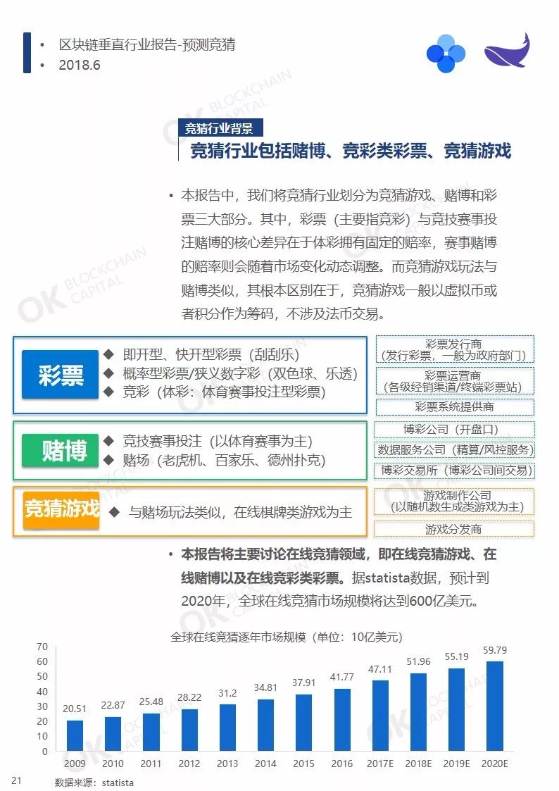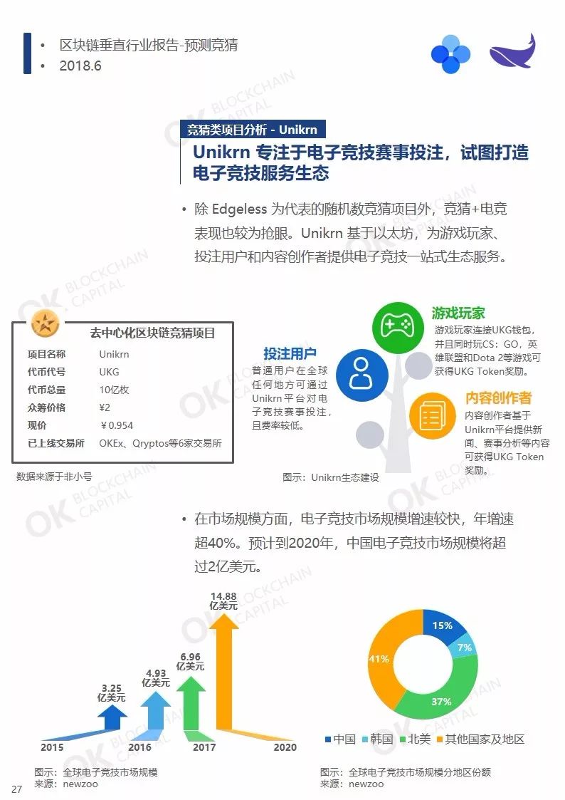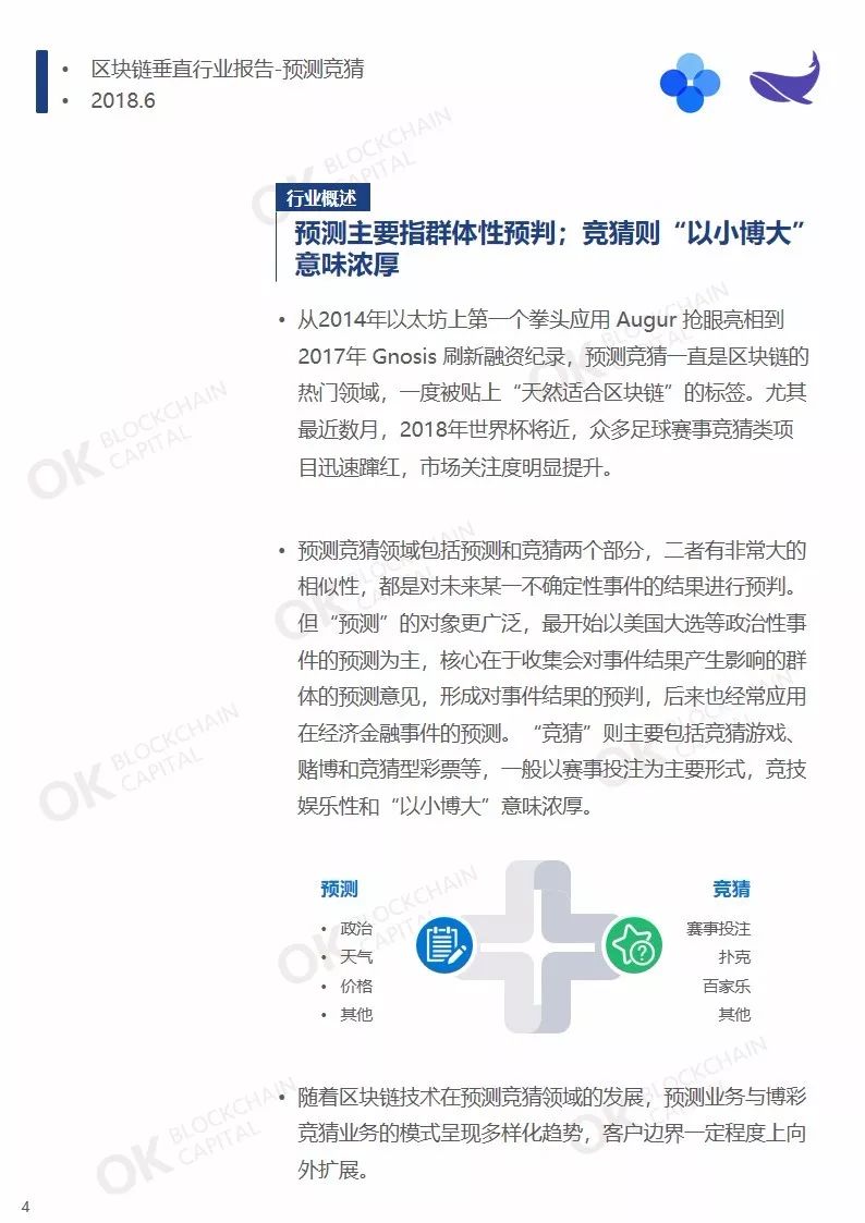 傳統預測競猜市場歷來存在著數據作假、中心化操縱等問題,區塊鏈的不可篡改、可追溯等特性以及智能合約的出現為預測競猜市場帶來了新的生機。2018世界杯的到來勢必又會引來體育行業的競猜熱潮,相關區塊鏈項目也是紛紛涌現,本報告從行業背景、區塊鏈的改造力、代表項目、行業未來趨勢等多個方面對預測競猜行業進行了解讀。其中,在競爭力方面,我們認為預測領域為了支持更多類型事件預測,Oracle數據是否能夠全領域覆蓋,滿足及時性和穩定性的要求至關重要;競猜領域,彩票類項目牌照成為非常稀缺的資源,能夠構成較高的壁壘。賭博類項目門檻相對較低,以賠率精算和風控為核心的開盤能力構成關鍵性競爭優勢。